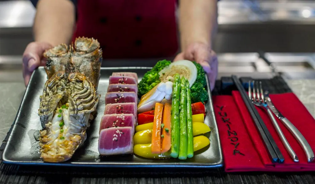 ב-Bistro @ The Beach של מקום האירוח מוגשות ארוחות באוויר הפתוח מול נופי הים, עם שילוב בין אוכל מקומי למערבי. מסעדת Yukinoya פתוחה כל יום, ומציעה מנות טפניאקי יפניות ייחודיות. יש גם טרקלין שמפניה ויין, ואפשרות לסעודה פרטית על החוף.